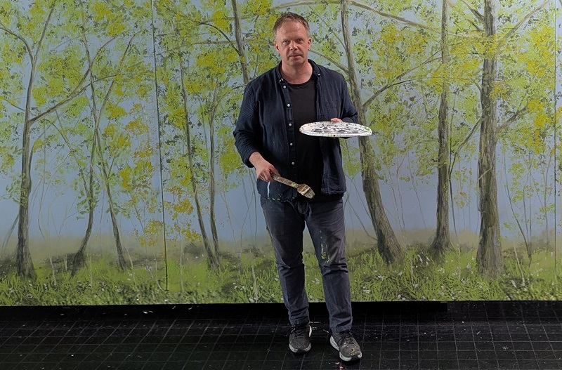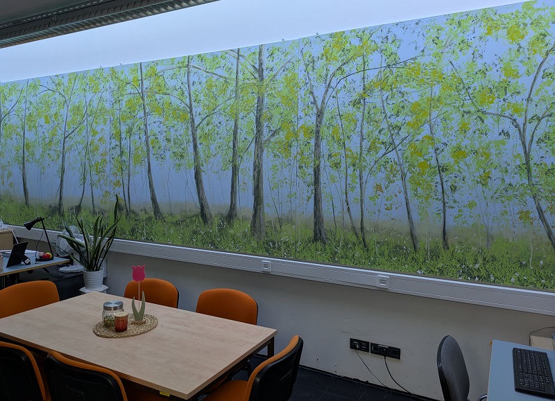 Warum eigentlich nicht!, dachte sich Sozialarbeiterin Patricia Heit und fragte Fachlehrer Christian Doil. Denn dieser hat bereits so viele Klassenräume in der BbS ABi mit Schülern und Schülerinnen verschönert. Ob eine gemalte Bibliothek mit Meer, eine Kirche, Motive von Da Vinci, Landschaften oder Wälder – viele Räume in der Schule sind einzigartig. Und so entstand auch für ihren Raum ein beeindruckendes Wandgemälde – ein lichter Frühlingswald, der den Raum in eine ruhige, einladende Atmosphäre taucht. Das großformatige Werk (1,80 m × 6,60 m) hat Christian Doil gemeinsam mit Schülerinnen und Schülern der 11. Klasse der Fachoberschule Gestaltung (BFOG.25) sowie des Berufsvorbereitungsjahres Farbtechnik, Raumgestaltung und Oberflächentechnik (BBVJ.25-B) realisiert. Die Herausforderung: Das Oberlicht im Raum sorgte bei starker Sonneneinstrahlung für eine grell leuchtende Wand und sollte durch ein helles, beruhigendes Motiv abgemildert werden. Angelehnt an Claude Monets „Große Dekorationen“ gestalteten die Schülerinnen und Schüler eine wunderbare Waldstimmung aus Himmel, Unterholz, Bäumen und Sträuchern – perfekt für einen Raum, in dem persönliche Gespräche und Beratung im Mittelpunkt stehen. Der Arbeitsprozess umfasste Aufmaß, Bau der Holzrahmen, Leinwandbespannung, Grundierung sowie das schrittweise Ausarbeiten des Motivs vom Hintergrund bis ins Detail. Ein herzliches Dankeschön gilt Herrn Wessel und dem BVJ Holztechnik für die Fertigung der Holzrahmen sowie den Hausmeistern für das fachgerechte Aufhängen des Gemäldes und natürlich Christian Doil für die Leitung des gelungenen Projektes.
