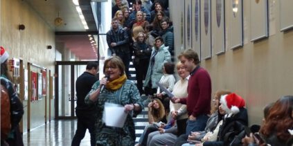 „In der Weihnachtsbäckerei“ – klingt es aus hunderten Schülerkehlen zu Beginn des traditionellen Weihnachtssingens am 19. Dezember 2025 in den BbS ABi. Zuvor hat Vertrauenslehrerin Heike Burschitz alle im Namen des Schülerrats und der Schulleitung begrüßt. Mit „Kling Glöckchen klingelingeling“ geht es weiter. Die Liedtexte lesen die Schüler digital im Handy. Sie stehen am Standort Bitterfeld auf den Gängen und Treppen im Bauteil C. Einige Lieder begleitet Adrian Dorn aus der Erzieherklasse am Klavier. Spätestens bei „Last Christmas“ von George Michael stimmen alle mit ein und bestehen auf einer Zugabe und Wiederholung. Im Weihnachtsmodus wippen rote Weihnachtsmützen und natürlich auch die Beine hin und her. Parallel waren auch die Schüler …