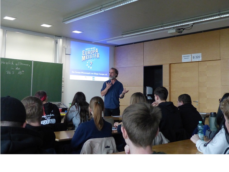 Es geht an diesem 14. November 2025 im Raum B 326 in den BbS ABi um den Europameister, aber nicht im Sport, sondern im Wissen über Europa und – um ganz genau zu sein – über die Europäische Union. Denn die ist für die Jugendlichen tatsächlich „ein weites Feld“ und ziemlich fern. Im spielerischen Umgang – mit einem Quiz – stellen sich zuerst die 20 Rohrleitungsbauer (BRL.25-A) den Fragen zur EU und 90 Minuten später die 18 Chemikanten (BCK.25-A). Eine Frage lautet zum Beispiel: „Die EU und ihre Mitgliedstaaten sind zusammen der größte…?“ Drei Antwortmöglichkeiten gibt es: Geber für Entwicklungshilfe, Verursacher von Schadstoffemissionen, Produzent von Mais. Mit Buzzern (TED-Abstimmungsgeräten) wird …
