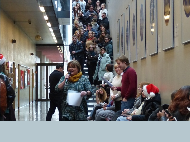 „In der Weihnachtsbäckerei“ – klingt es aus hunderten Schülerkehlen zu Beginn des traditionellen Weihnachtssingens am 19. Dezember 2025 in den BbS ABi. Zuvor hat Vertrauenslehrerin Heike Burschitz alle im Namen des Schülerrats und der Schulleitung begrüßt. Mit „Kling Glöckchen klingelingeling“ geht es weiter. Die Liedtexte lesen die Schüler digital im Handy. Sie stehen am Standort Bitterfeld auf den Gängen und Treppen im Bauteil C. Einige Lieder begleitet Adrian Dorn aus der Erzieherklasse am Klavier. Spätestens bei „Last Christmas“ von George Michael stimmen alle mit ein und bestehen auf einer Zugabe und Wiederholung. Im Weihnachtsmodus wippen rote Weihnachtsmützen und natürlich auch die Beine hin und her. Parallel waren auch die Schüler …