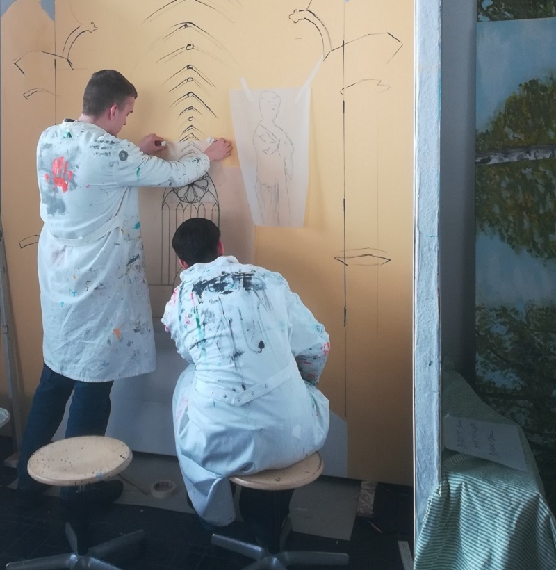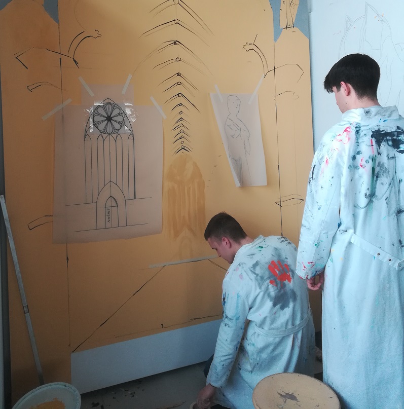 Christian Doil: „Im Malprozess wurde deutlich, dass es nicht möglich war mit Projektionsverfahren zu arbeiten. Die Fachoberschule Gestaltung hat im Theorieunterricht Technisches Zeichnen und Darstellende Geometrie verschiedene Fluchtpunktmethoden kennengelernt. Die Zentralperspektive, die schon häufig in der Renaissance Anwendung fand, wurde nun auch in diesem Projekt genutzt. Es wurde ein zentraler Fluchtpunkt auf der Leinwand markiert. Mit zwei Meter langen Linealen wurde der Verlauf der ‚Tiefenlinien‘ zu dem markierten Fluchtpunkt hin gezeichnet. Die Kathedrale ist ein gotisches Bauwerk. Im Theorieunterricht hat die Klasse BFOG.24 (Fachoberschule Gestaltung) verschiedene Bogenkonstruktionen durchgeführt und gotische Maßwerke konstruiert. Diese Formen fanden jetzt praktische Anwendung. Die Gotik war auch die Zeit der Zahlen- und Lichtmystik. Deshalb kommt dem zentralen Rosenfenster mit seinem farbigen Glas eine zentrale Rolle zu. Wenn das Sonnenlicht durch diese Fenster fiel, konnten Farblichtspiele auf dem Boden und auf den Wänden beobachtet werden. Das Fenster wurde in einem geeigneten Maßstab detailliert von Fachlehrer Christian Doil auf Transparentpapier konstruiert und folgend auf die Leinwand mit Kohlepapier übertragen. Ein Schüler der Fachoberschule Gestaltung half bei der Farbgestaltung des Fensterglases. Ein anderer Schüler und eine Schülerin konstruierten den großen Spitzbogen des Portales mit einem großen Zirkel. Parallel wurde im Fach Grundlagen der Gestaltung ein Hefter zum Thema Baustilkunde (Griechische Antike bis Moderne) mit Skizzen und Zeichnungen von jedem Schüler und jeder Schülerin angefertigt. Die Stilmerkmale der Gotik wurden somit in Theorie und Praxis umgesetzt. In der Kunstgeschichte findet man viele Werke, die ihre Erschaffer oder Auftraggeber zeigen. Von Botticelli, Caravaggio bis Dürer- alle haben sich auch selbst ins Werk gemalt. Wer Interesse hat, kann sich die Steinfiguren etwas genauer ansehen. Als kleines Augenzwinkern ist ein Abbild der originalen Worcestersauce zu entdecken. Es darf sich beim Betrachten auch über die Aussprache der berühmten Würze ausgetauscht werden.“