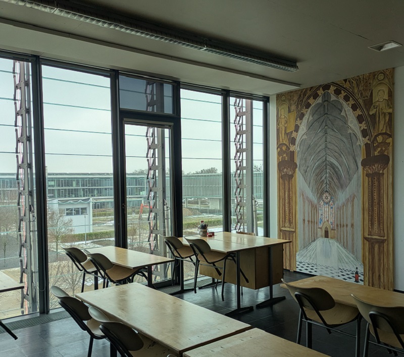 Am Anfang bemerkte Christian Doil, Fachlehrer für Gestaltung, ein Profilbild, das Kollegin und Englischlehrerin Bettina Clayton auf einem Messengerdienst verwendet. Verwundert fragte er nach. Das Foto zeigte das Rosenfenster der gotischen englischen Kathedrale in Worcester. Bettina Clayton hat zu dieser einen ganz persönlichen Bezug. Fragt sie einfach! Frau Clayton unterrichtet Englisch im Raum C 336. Doil ist gelernter Steinmetz/Steinbildhauer und hat schon zehn Jahre in Mainz Steinmetze und Steinbildhauer ausgebildet. Und so entstand gemeinsam die Idee, das Gemälde als Motiv für den Unterricht zu benutzen und Bettina Claytons Unterrichtsraum C336 mit eben diesem Bild zu verschönern und eine ganz besondere Atmosphäre zu schaffen.