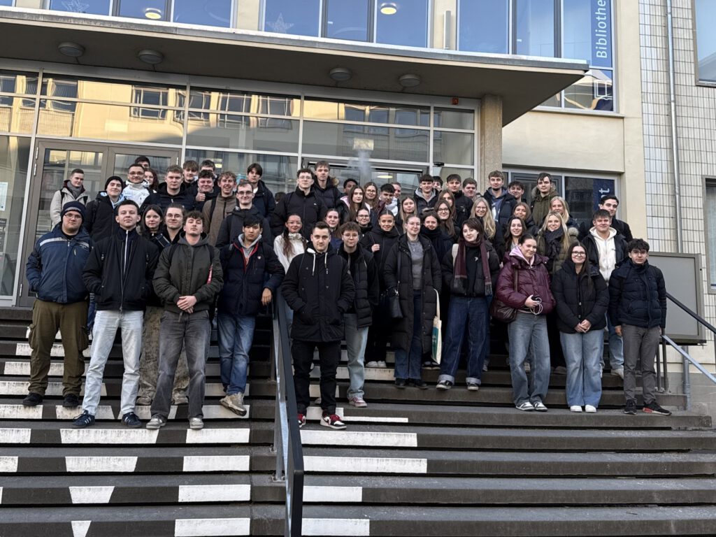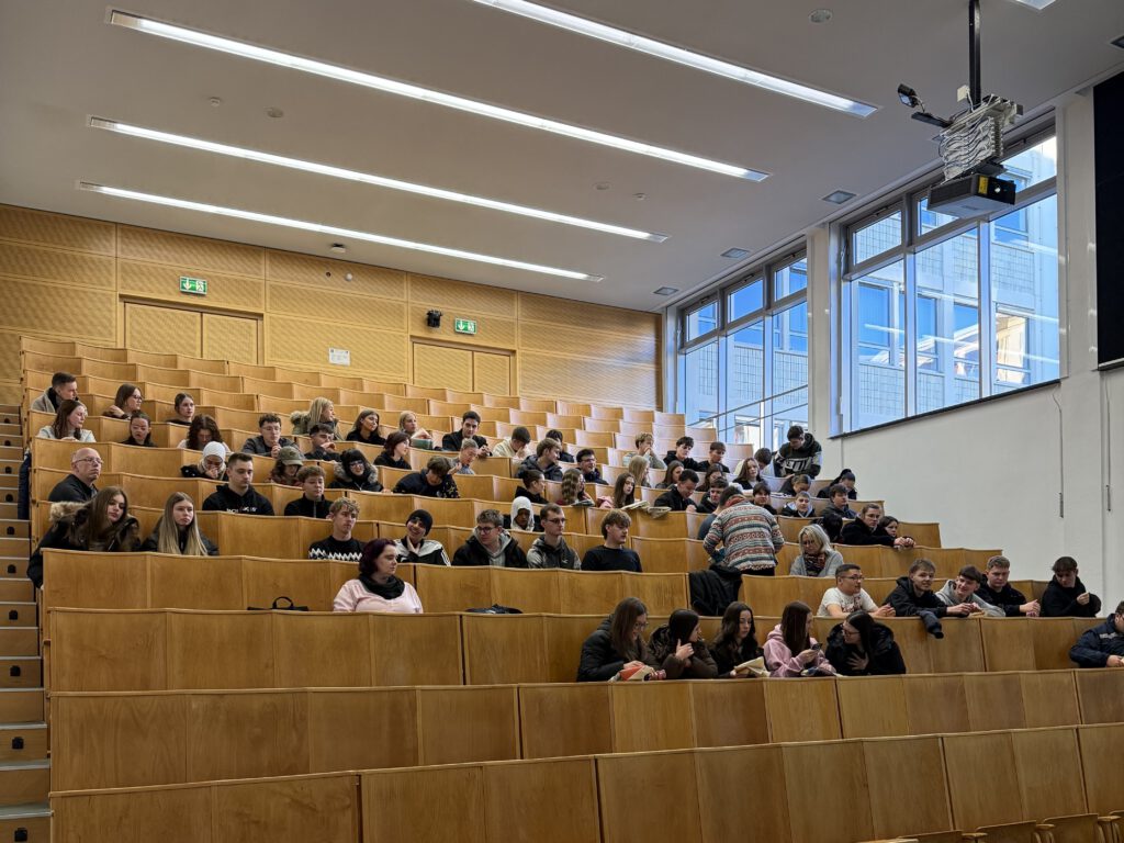 Vor Ort wurden die Schülerinnen und Schüler herzlich empfangen und im Rahmen einer Campusführung über das Gelände begleitet. Dabei erhielten sie interessante Informationen zur Hochschule, zu den Studiengängen sowie zu den Gebäuden und Einrichtungen. Besonders beeindruckend war der Besuch eines großen Hörsaals, der einen realistischen Eindruck vom späteren Studierendenalltag vermittelte.