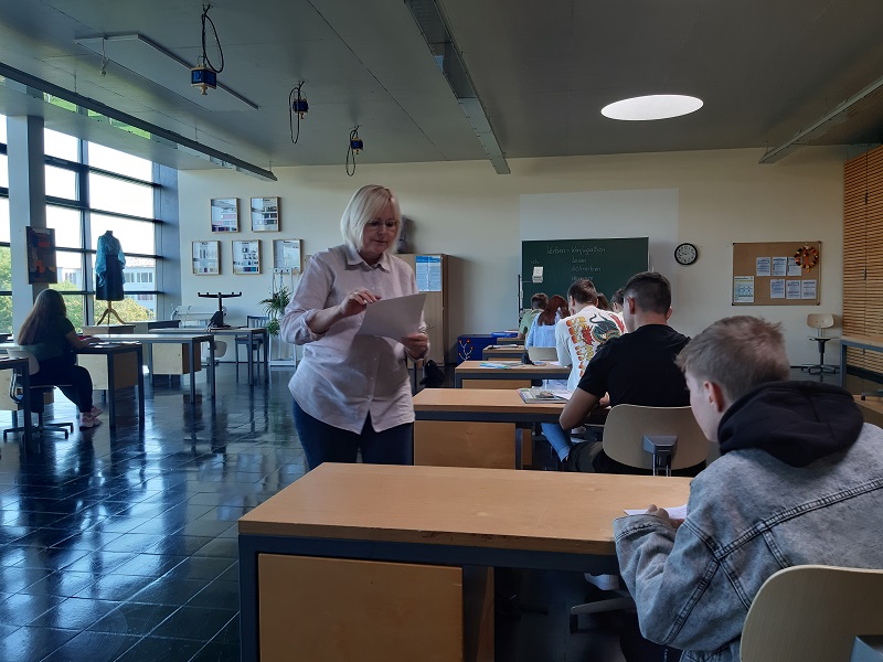„Guten Morgen“ – heißt es am 12. September 2022 im Raum D 263. Lehrerin Silke Reinsch begrüßt ihre Klasse, die BBVU.22. Acht junge Männer und fünf junge Frauen haben Platz genommen. Eine Mutter wartet im Klassenraum. Sie hat die Unterlagen ihrer Tochter dabei. Silke Reinsch nimmt die Unterlagen entgegen. Sie hat kaum mit dem Unterricht angefangen, als es klopft. Sie öffnet. Eine neue Schülerin betritt den Raum. Neugierig sehen Alexandra, Pavlo, Veronika, Andre‘, Danilo, Kira, Sergej und die anderen zur neuen Klassenkameradin. Sie sind mitten in der Vorstellungsrunde. Ich heiße, ich wohne, ich bin… – steht an der Tafel. Die Schüler sind zwischen 15 und 18 Jahren alt und kommen aus der Ukraine, aus Kiew und Charkiw und aus anderen Städten. „Michail – schlagen Sie Ihr Buch auf!“, sagt Silke Reinsch. Doch Michail versteht die Anweisung nicht. Die anderen helfen. „Knischka!“, flüstern sie, das heißt Buch in ihrer Sprache. Michail hat jetzt verstanden. Aufstehen, anschreiben, hinsetzen – alles das muss erst in der neuen Sprache erlernt werden. „Es ist nicht so leicht“, sagt Silke Reinsch, „aber sie machen gut mit. Ich unterrichte sie gerne!“ Dann teilt sie Arbeitsblätter aus: „Danke!“, sagt André und die Lehrerin freut sich und sagt: „Wir sagen bitte und danke!“ Und wir – die BbS ABi – sagen: Herzlich willkommen.