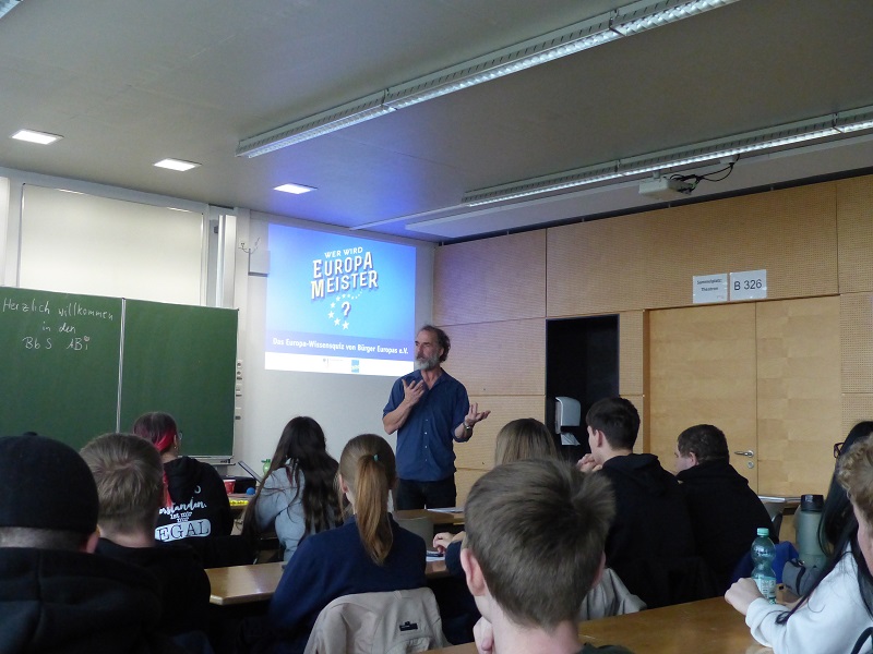 Es geht an diesem 14. November 2025 im Raum B 326 in den BbS ABi um den Europameister, aber nicht im Sport, sondern im Wissen über Europa und – um ganz genau zu sein – über die Europäische Union. Denn die ist für die Jugendlichen tatsächlich „ein weites Feld“ und ziemlich fern. Im spielerischen Umgang – mit einem Quiz – stellen sich zuerst die 20 Rohrleitungsbauer (BRL.25-A) den Fragen zur EU und 90 Minuten später die 18 Chemikanten (BCK.25-A). Eine Frage lautet zum Beispiel: „Die EU und ihre Mitgliedstaaten sind zusammen der größte…?“ Drei Antwortmöglichkeiten gibt es: Geber für Entwicklungshilfe, Verursacher von Schadstoffemissionen, Produzent von Mais. Mit Buzzern (TED-Abstimmungsgeräten) wird abgestimmt und das Ergebnis eingeblendet. 85 Prozent der Rohrleitungsbauer wählen die „1 – die EU ist der weltweit größte Geber für Entwicklungshilfe“. Und das ist auch die richtige Antwort. Wer am schnellsten die richtige Lösung gedrückt hat, erhält einen Preis. Das motiviert auch zum Zuhören. „Was ist Solidarität?“, fragt Heiko Fröhlich die Schüler. Keiner weiß es. Geduldig und einfach erklärt er das Gemeinschaftsprinzip. Und so berichtet der Moderator vom Bürger Europas e.V. ganz nebenbei von den Vorteilen der EU: der Reisefreiheit, der Zollfreiheit; der Freiheit, seinen Beruf innerhalb der EU auszuüben; der gegenseitigen Unterstützung, einheitlicher Sozialstandards, Produktstandards, einer einheitlichen Klimapolitik etc. Denn die EU ist eben nicht nur ein Wirtschaftsverbund. Die Regeln werden von allen Ländern beschlossen. Das macht es natürlich nicht einfach, auch das sagt er. Der Verein Bürger Europas e.V. hat das Quiz entworfen. Gefördert vom Auswärtigen Amt wird so auf leichte Art politische Bildung vermittelt und aufgeklärt. Heiko Fröhlich fragt die Schüler, hakt nach, fragt nach ihren eigenen Interessen. Dass man innerhalb der EU als EU-Bürger frei wählen kann, wo man wohnt, in welchem Land man seinen Beruf ausüben will und dass man ohne Grenzkontrollen reisen kann – ist nach dem Quiz allen klar und das ist ja auch das Ziel des Quiz, wie der Moderator schon am Anfang sagt: „Ihr wisst mehr als vorher.“