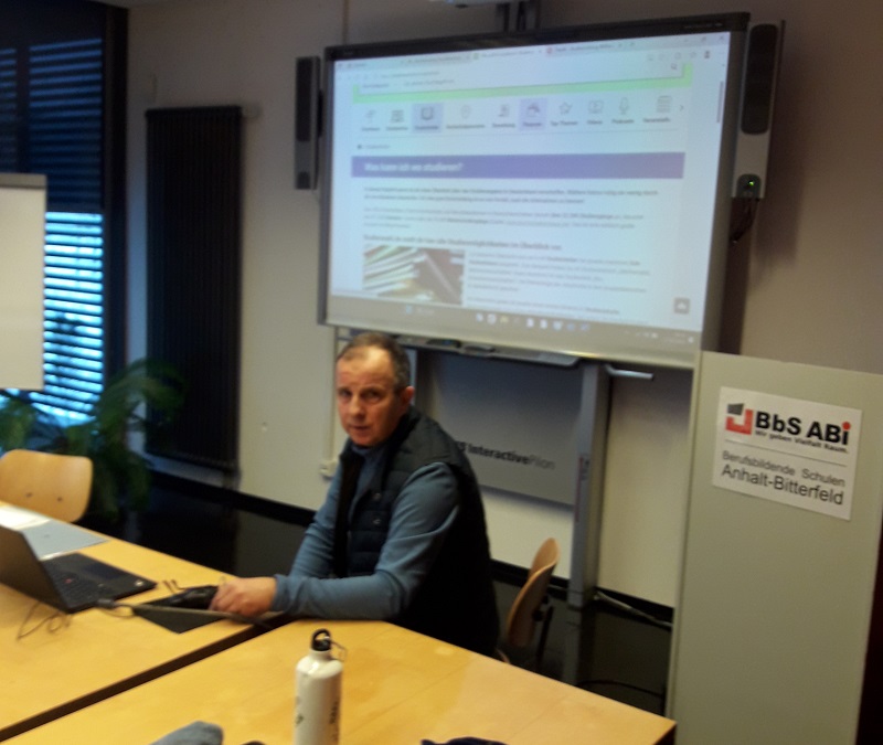 Ihr wisst nicht, wohin nach der Schule oder Ausbildung? Wir haben Beratungsangebote in unserer Schule. Einfach einen Termin sichern! Thomas Tilgner von der Arbeitsagentur informiert Euch. Im Moodle-Kurs „Berufsberatung“ (hier der Link: Berufsberatung | Herzlich Willkommen auf der Lernplattform der Berufsbildenden Schulen Anhalt-Bitterfeld bzw. https://moodle.bildung-lsa.de/bbs-abi/enrol/index.php?id=1025#tabs-tree-start) könnt Ihr Euch einen Termin sichern. Diese Woche wurden die Schüler der Klasse 11 der Fachoberschule über verschiedene Möglichkeiten der Berufsfindung für die Zeit nach dem Abschluss in Klasse 12. Informiert. Den Reigen eröffnete an 17.Februar 2026 die BFOG.25 (Fachoberschule Gestaltung). Was da ablief? Thomas Tilgner betonte zunächst die Wichtigkeit, sich bereits jetzt umfassend darüber zu informieren, wie es nach Klasse 12 beruflich weitergeht. Sich bei der Auswahl aus mehreren hundert Ausbildungsberufen und mehreren tausend Studienrichtungen zu entscheiden, ist nicht einfach und sollte reiflich überlegt sein. Die Mehrheit der Schüler war sich – auf Nachfrage – noch nicht sicher, was der zukünftige Traumberuf sein wird. Um dem Abhilfe zu schaffen, stellte Tilgner verschiedene Plattformen wie „Studienwahl“ vor. Anschließend zeigte er den Schülern, dass es außer einer Ausbildung oder einem Studium auch Überbrückungsangebote wie beispielsweise ein FSJ (Freiwilliges Soziales Jahr) gibt. Am Ende beantwortete er beantwortete noch Fragen zum dualen Studium und Bafög und wies auf die individuellen Beratungstermine an unserer Schule hin. Noch unsicher, was werden soll? Bucht einfach einen Termin!